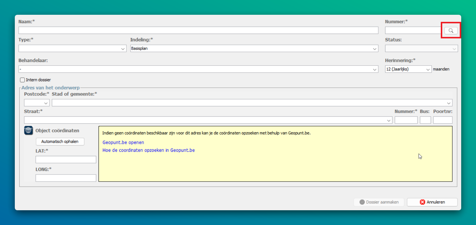 - Bij het aanmaken van een dossier is er nu een knop beschikbaar om het volgende dossiernummer te genereren (De 3 dossierletters moeten wel zelf eerst ingetytpt worden)